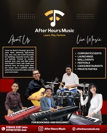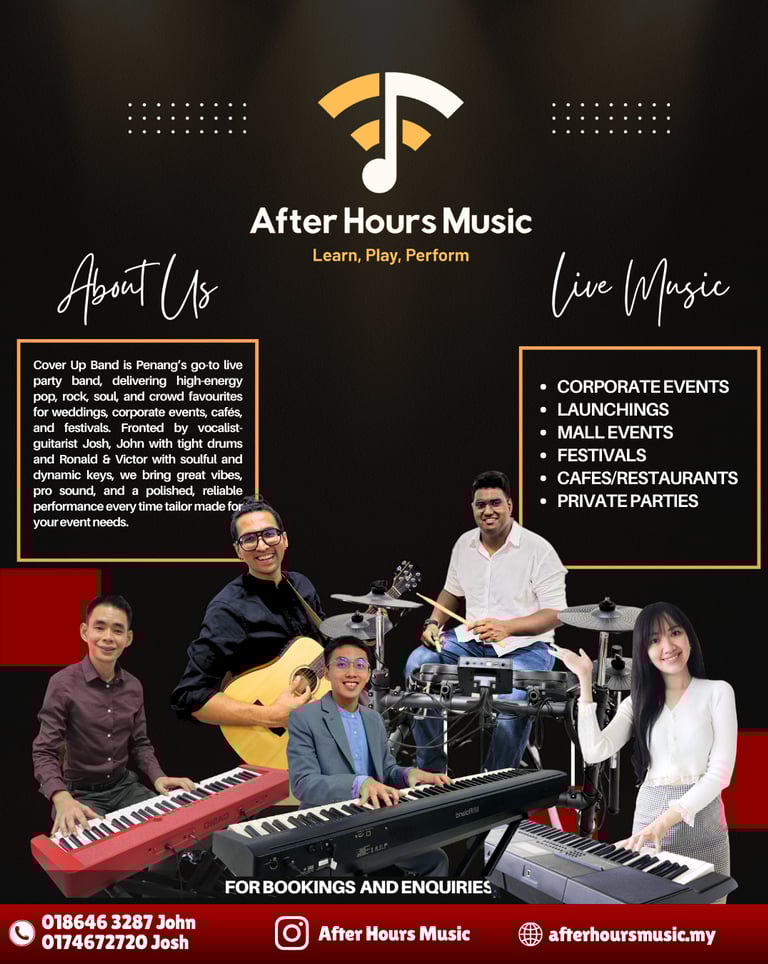 After Hours Music offers music lessons taught by active performers, designed to equip learners to become confident, stage-ready musicians. Our approach is simple: Learn • Play • Perform — combining practical technique with essential music theory and real performance coaching. Lessons are available for drums, vocals, piano, and acoustic guitar, with guidance on timing, tone, musicality, and stage presence so students don’t just practice… they can truly perform.